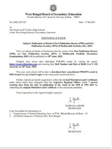 Posted On: 17/06/2025This is to inform all concerned students that the West Bengal Board of Secondary Education (WBBSE) will publish the results of Post Publication Review (PPR) and Post Publication Scrutiny (PPS) of the Madhyamik Examination 2025 on 18th June 2025.